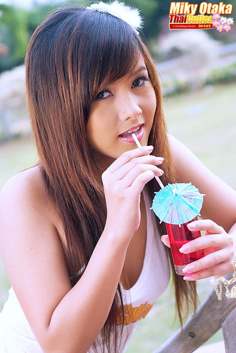 Thai Cuties: Asian babe Miky Otaka toying her big racks and pussy in the backyard