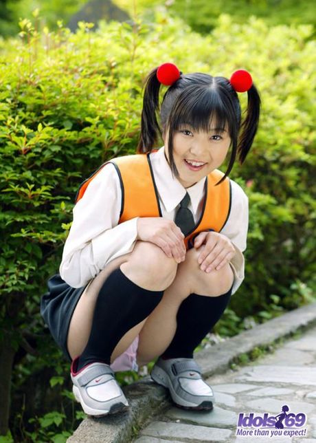 Idols 69: Asian slut in pigtails and uniform shows her hairy pussy and her favorite toys