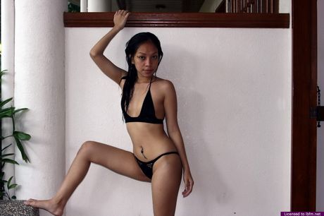 Barfine2cash: Asian teen amateur girl strips and shows her pierced tits and pussy poolside