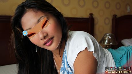 Asian Sex Diary: Asian teen Ella strips to her stockings and shows her tiny tits and ass
