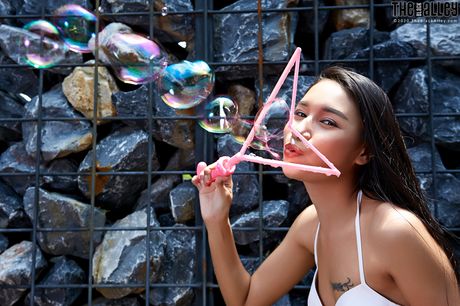 The Black Alley: Platinum Asian Mia presents her sexy butt and hairy cunt in a solo outdoors